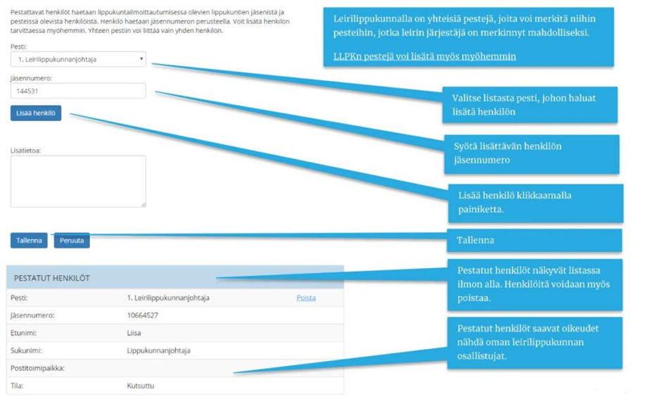 Leirilippukunnassa on vastuupestejä, jotka jaetaan leirilippukuntailmoittautumisessa valittujen lippukuntien johtajaikäisen jäsenistön kesken. Kuhunkin pestiin voi kiinnittää yhden henkilön. Ilmoittamiseen tarvitset pestattavan henkilön jäsennumeron.